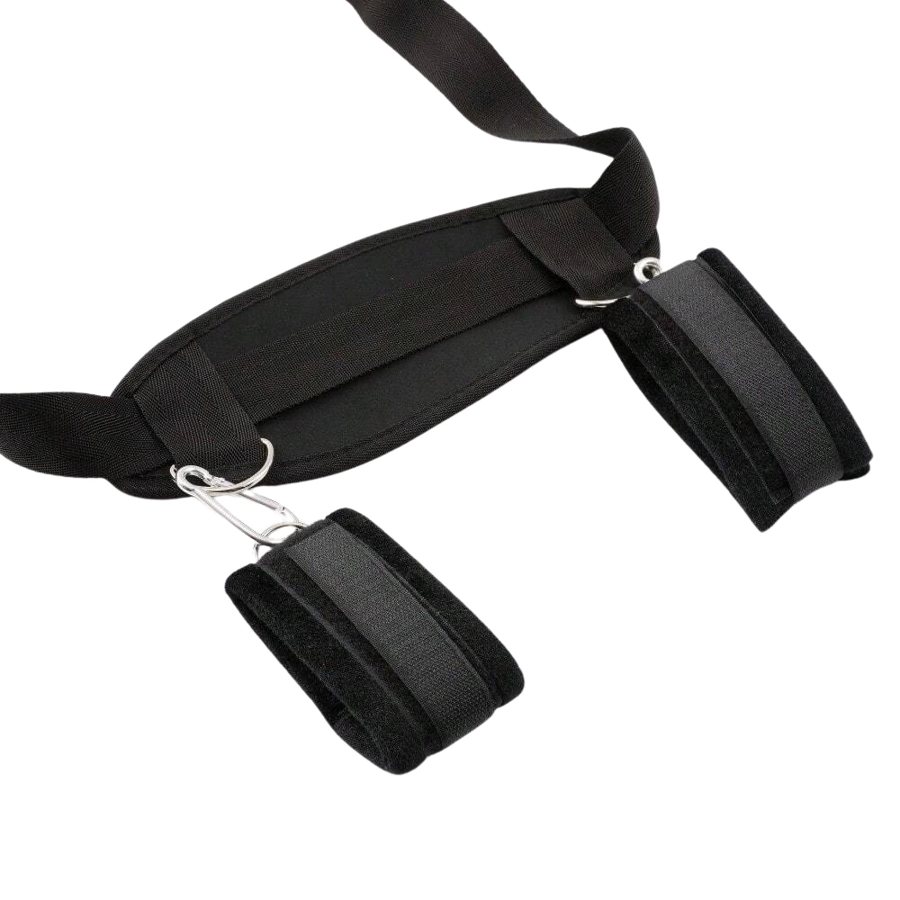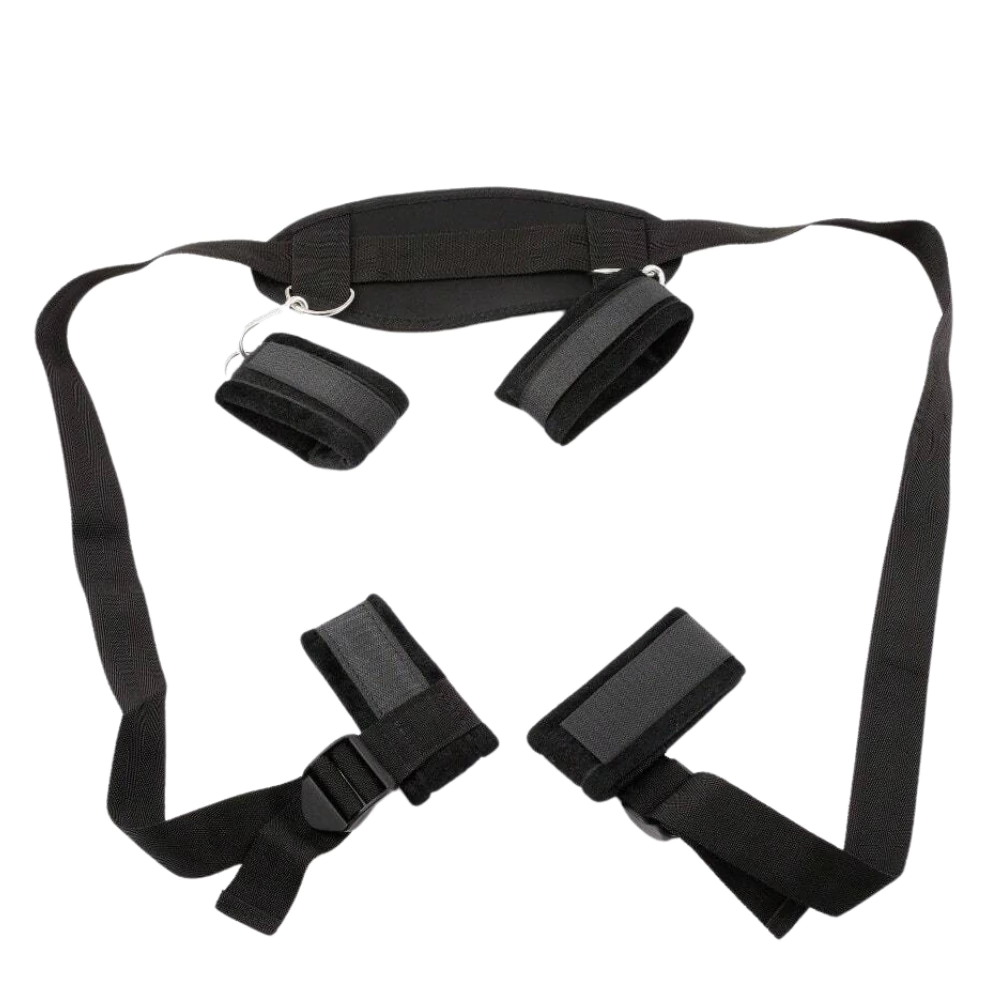 Acompanha amarra ajustável que conecta tornozelos à almofada do pescoço, 2 tornozeleiras e 2 algemas em couro ecológico com fecho em velcro. A almofada garante conforto durante as posições mais ousadas. Um convite irresistível à entrega e ao prazer.