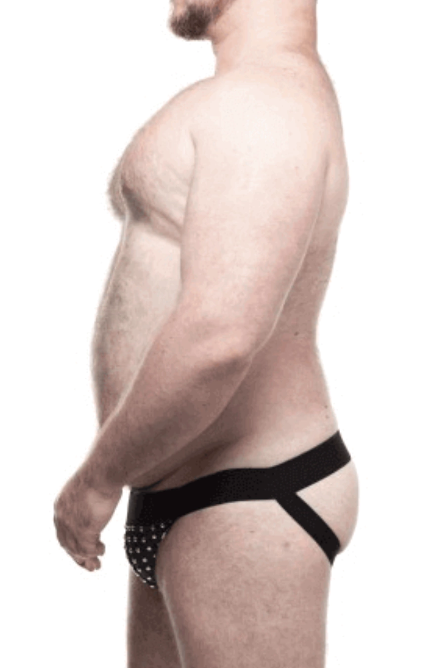 Vista como uma cueca convencional. A parte frontal cobre parcialmente a região íntima, destacando os detalhes com rebites, enquanto a parte traseira totalmente aberta valoriza os glúteos. Ideal para ocasiões especiais ou práticas de dominação e fetiche.